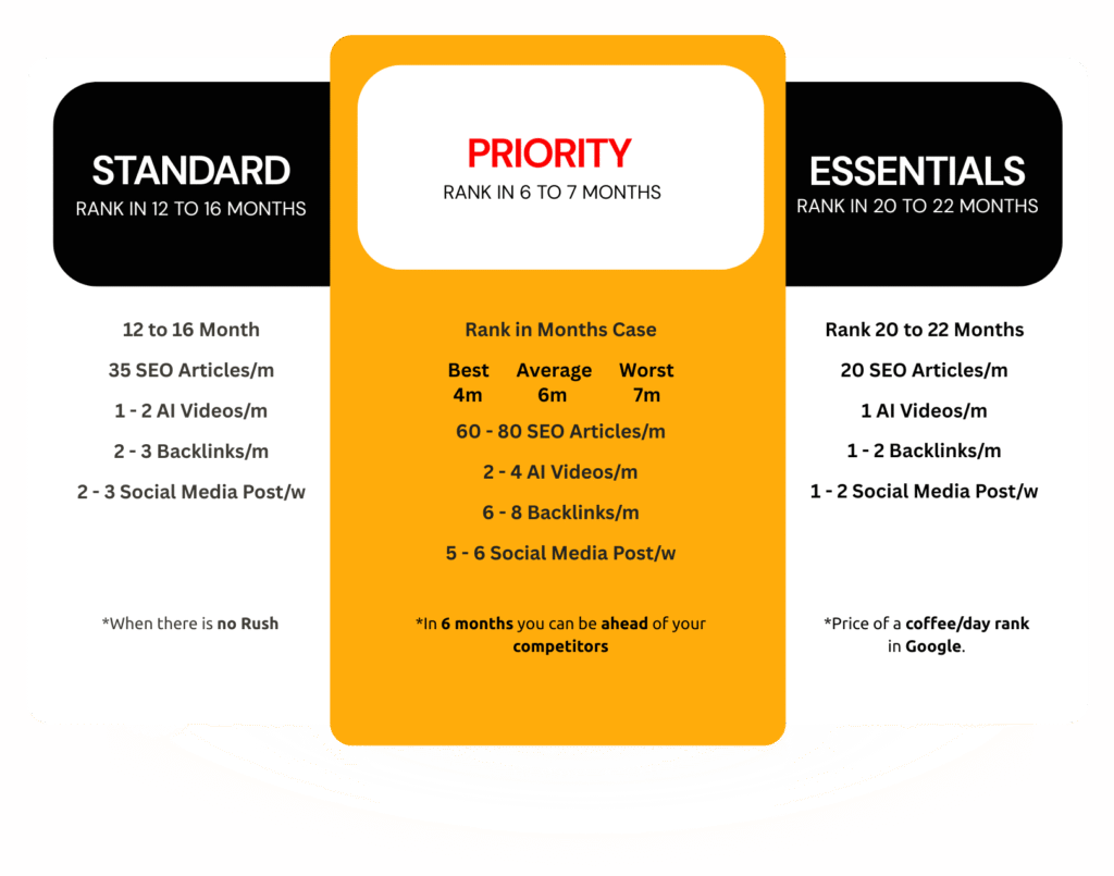 We guaranteededicated, data-driven SEO efforts and transparency with measurable progress. While exact timelines may vary, our strategies maximize yourvisibility, traffic, and clients. If you don’t rank by the given package timeframe, you seekrefund policies.